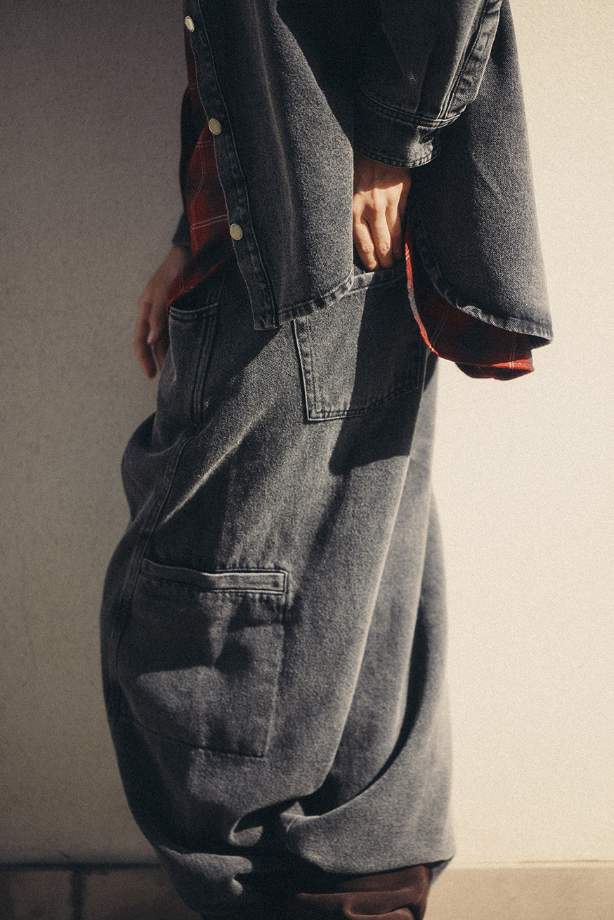 Jeansy military damskie to nowoczesna interpretacja klasycznych spodni cargo. Uszyte z denimu w odcieniu washed black, zachowują ponadczasowy charakter, a jednocześnie zyskują oryginalny, militarny akcent. Boczne kieszenie na wysokości kolan dodają funkcjonalności i stylu, a regulacja guzikami w pasie – znana już z klasycznego modelu – pozwala na idealne dopasowanie do sylwetki.
