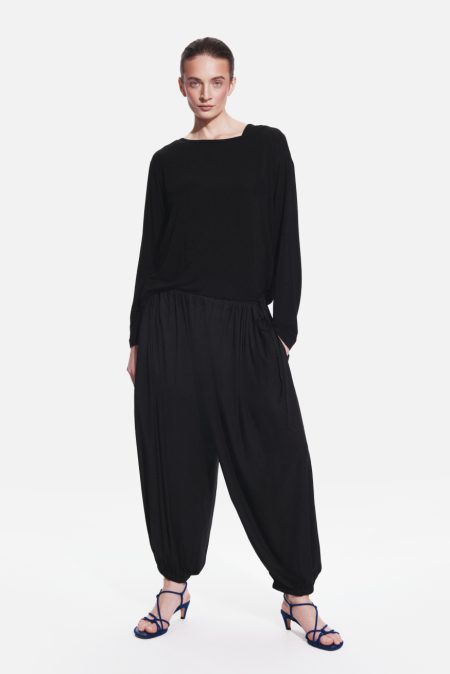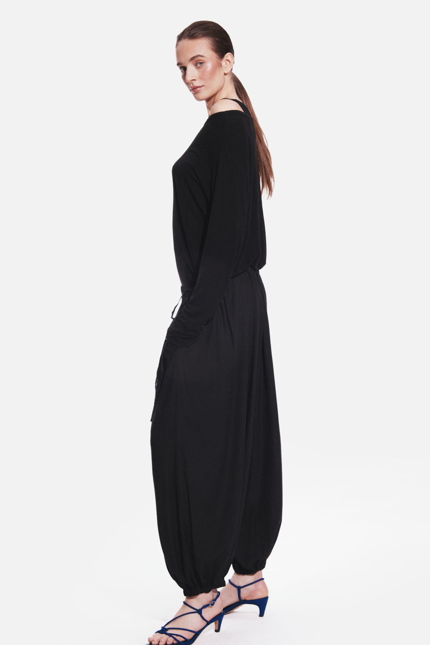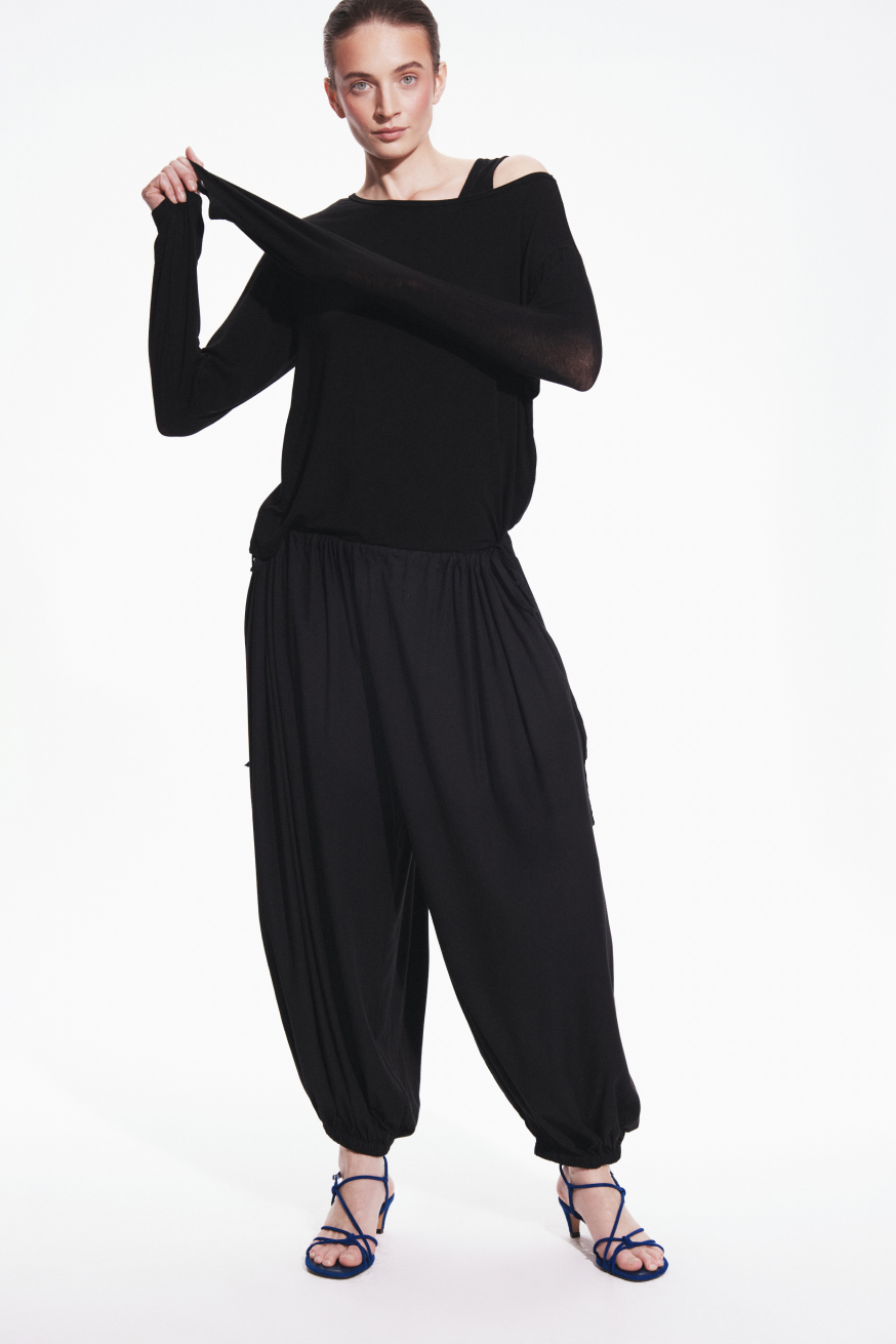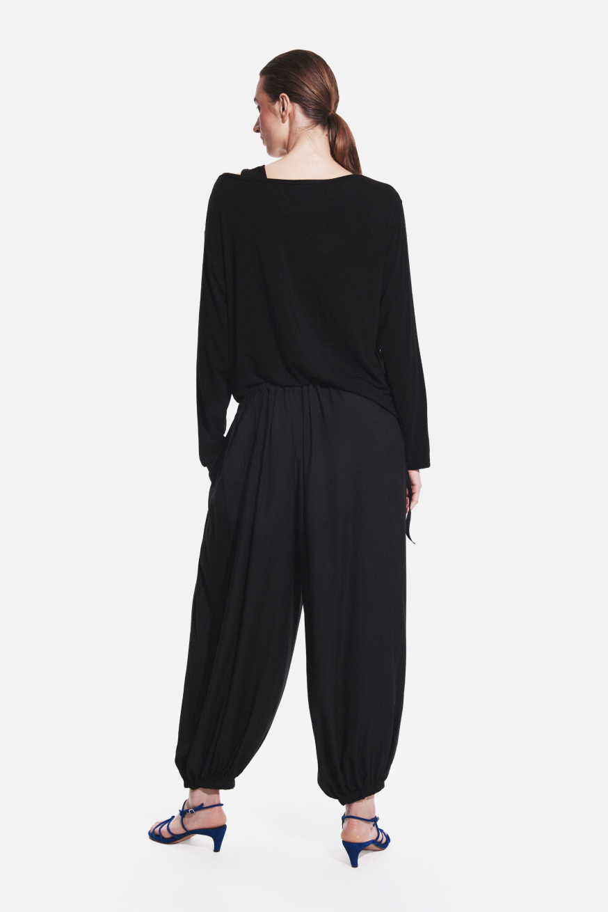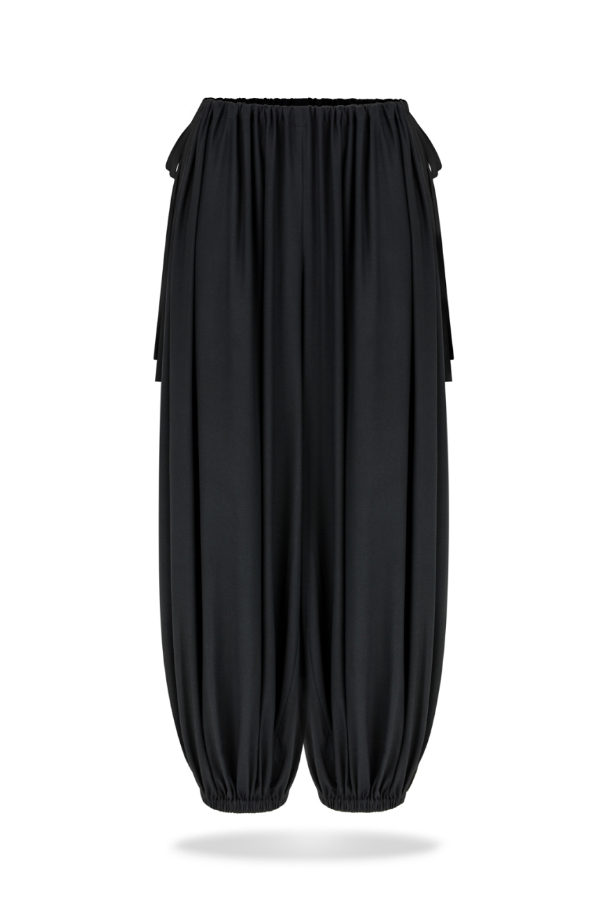 Lightweight, relaxed and designed for effortless comfort. These harem-style baggy trousers feature a loose, softly draped silhouette that creates a distinctive sense of volume and ease. The tapered legs finished with gentle elastic cuffs enhance the shape and give the design a modern, slightly sculptural feel. Adjustable drawstrings at the waist provide a personalised fit while ensuring all-day comfort and freedom of movement. Two practical side pockets add everyday functionality while maintaining the clean, minimalist look of the trousers.