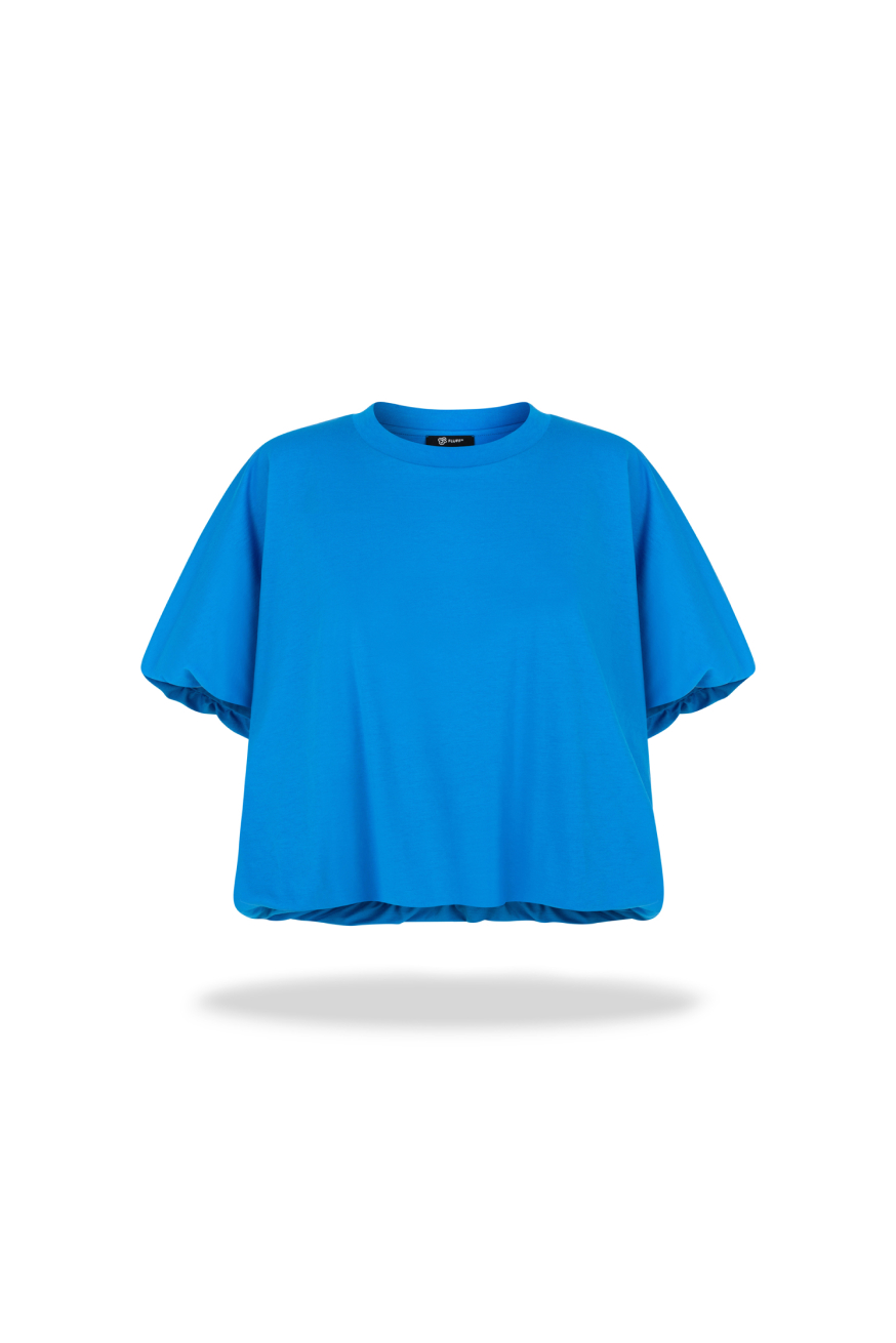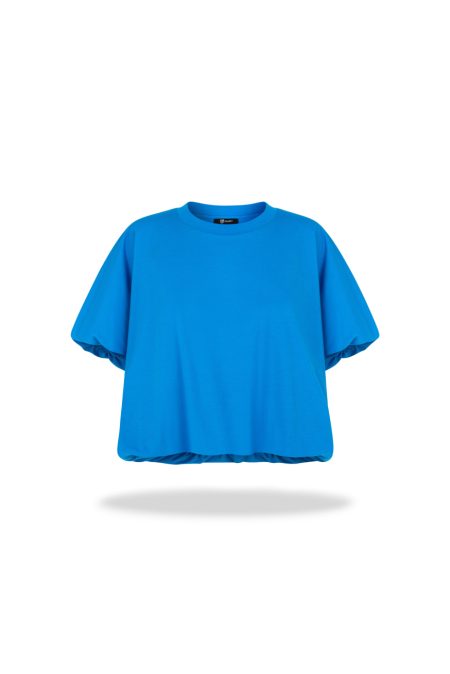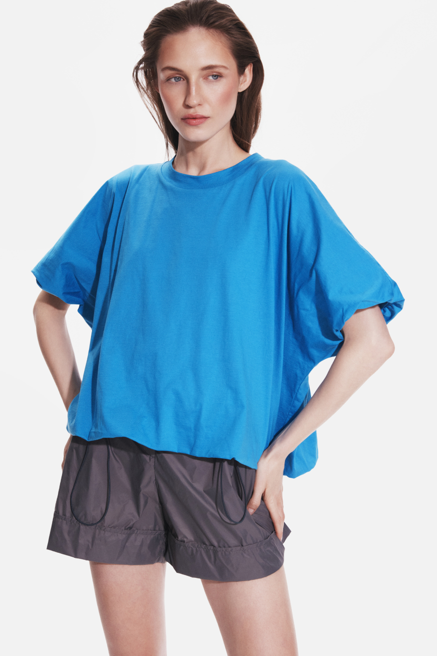 A modern take on the classic T-shirt, where simplicity meets thoughtful construction. This design features a softly ballooned silhouette created by an elasticated hem that adds gentle volume and a subtle sculptural shape. The double-layered cotton material gives the piece structure while remaining breathable and comfortable. Relaxed sleeves and an easy fit enhance the contemporary feel, balancing minimal design with a distinctive silhouette.
