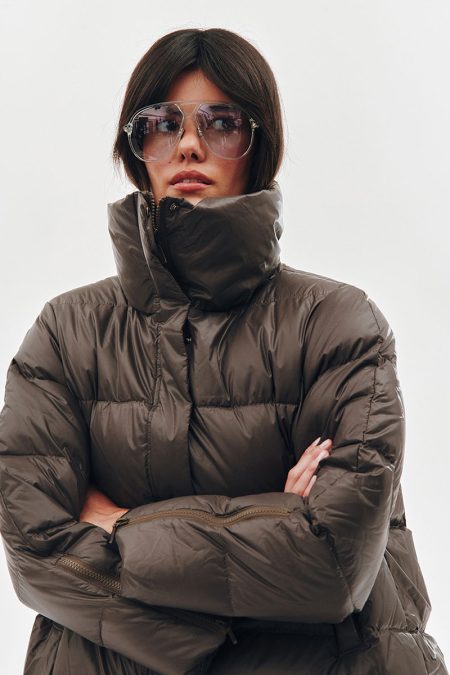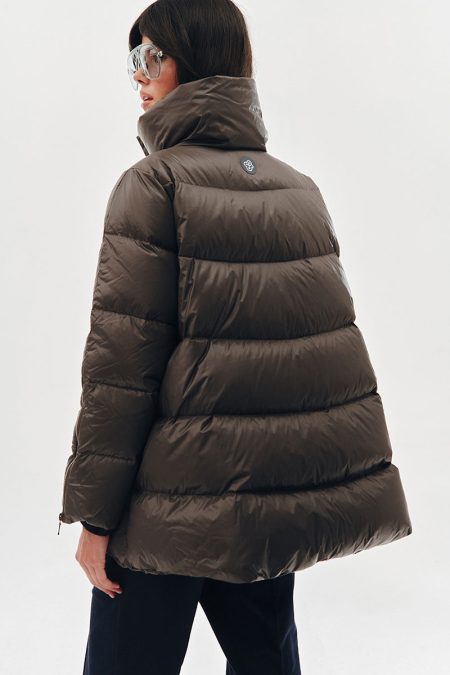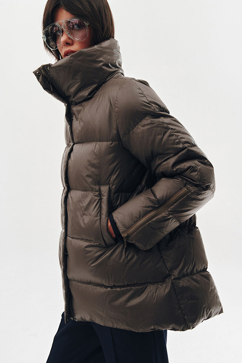 • Down jacket in a cool shade of greyish brown with a slight sheen, high collar, convenient pockets and zips on the sleeves. This down jacket expands downwards like the iconic bell bottoms.