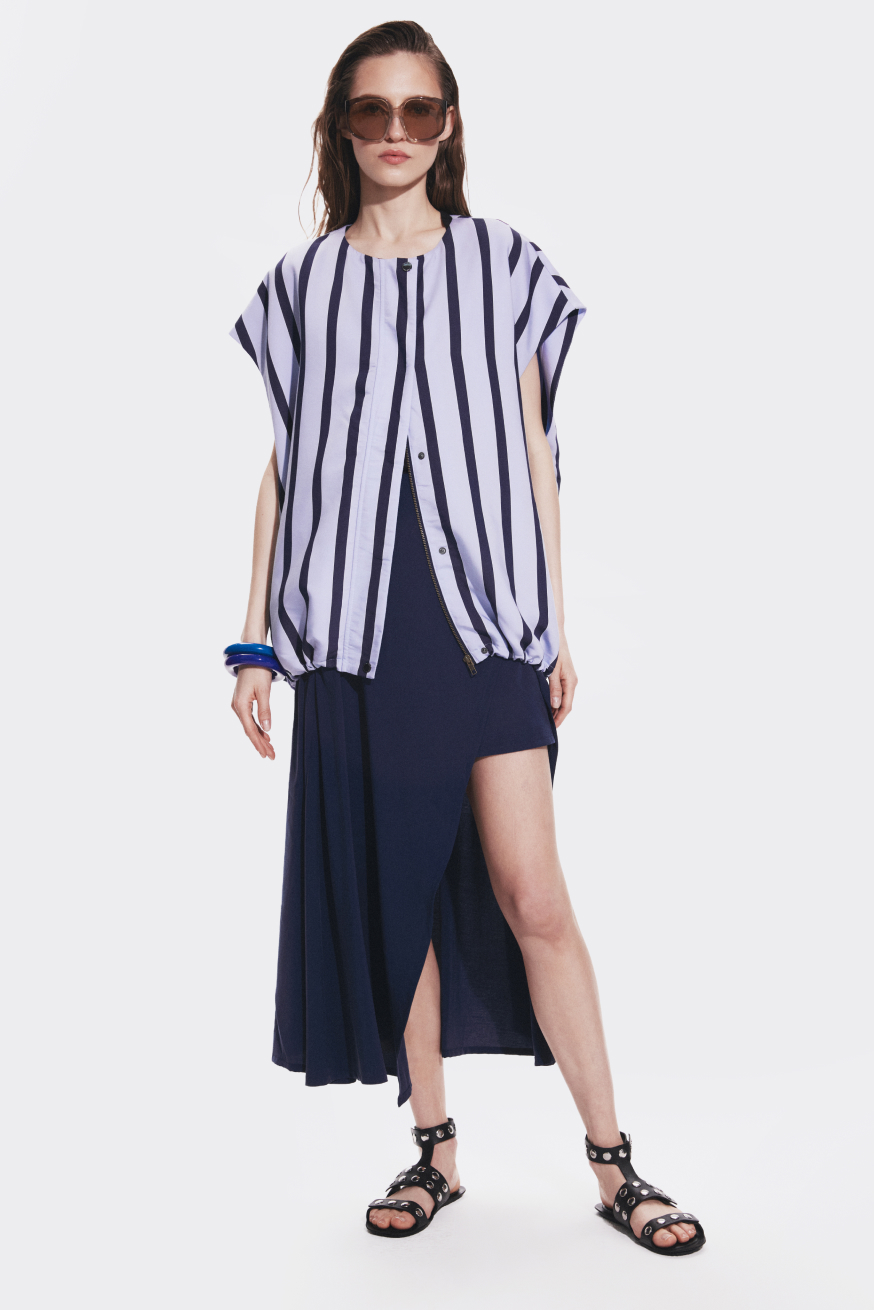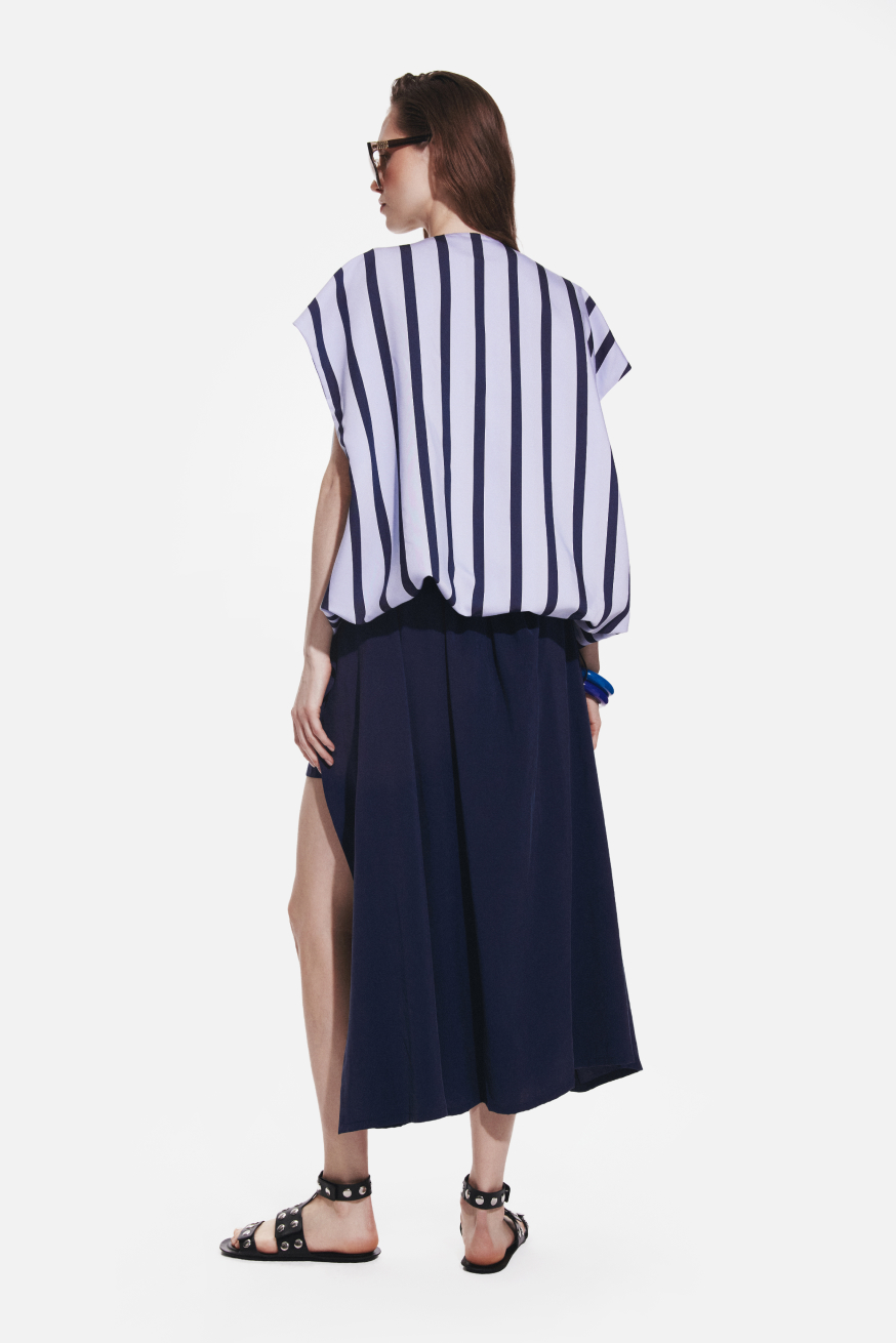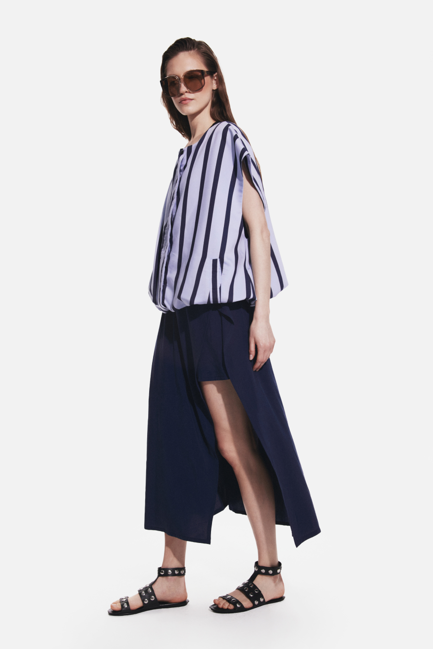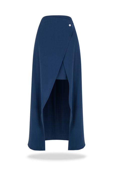 A modern interpretation of the classic midi skirt, where construction and movement take centre stage. This design features a fluid, asymmetric silhouette enhanced by soft pleats that create lightness and natural motion. The outer layer subtly opens as you move, revealing a shorter underskirt beneath: a contemporary detail that adds depth and an elegant layered effect.