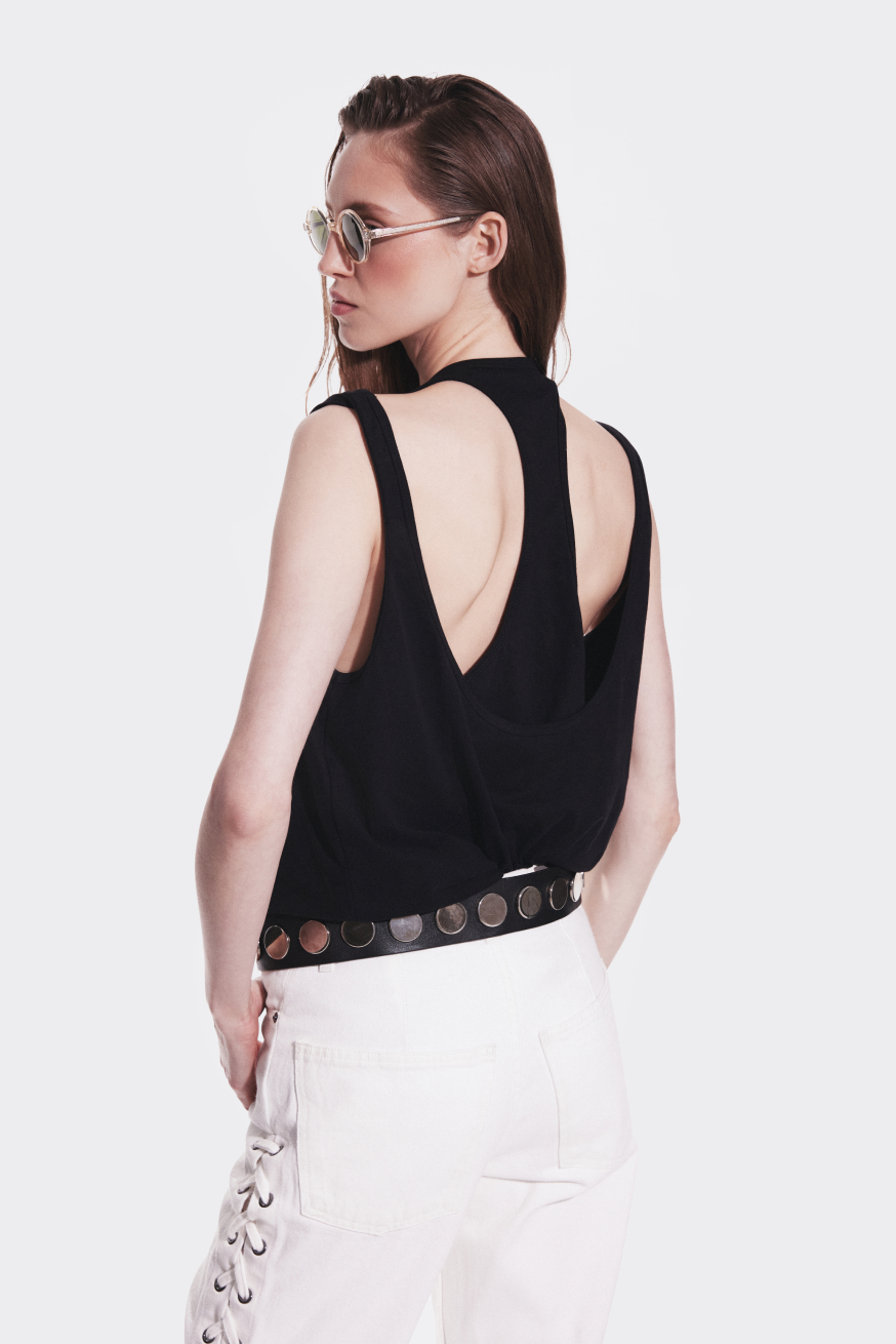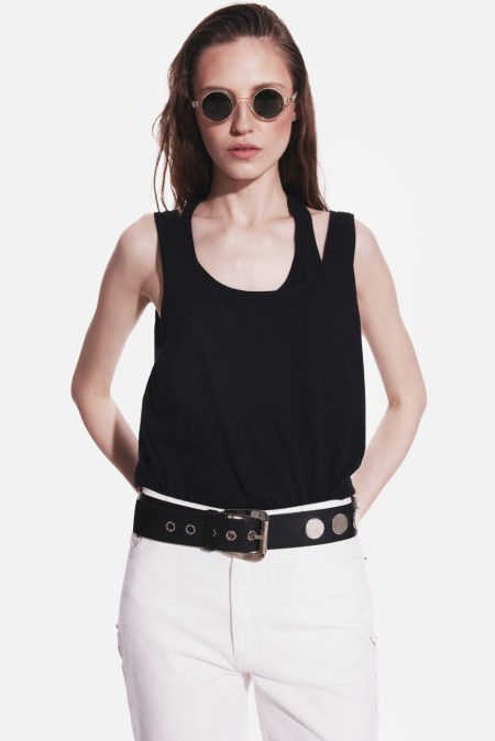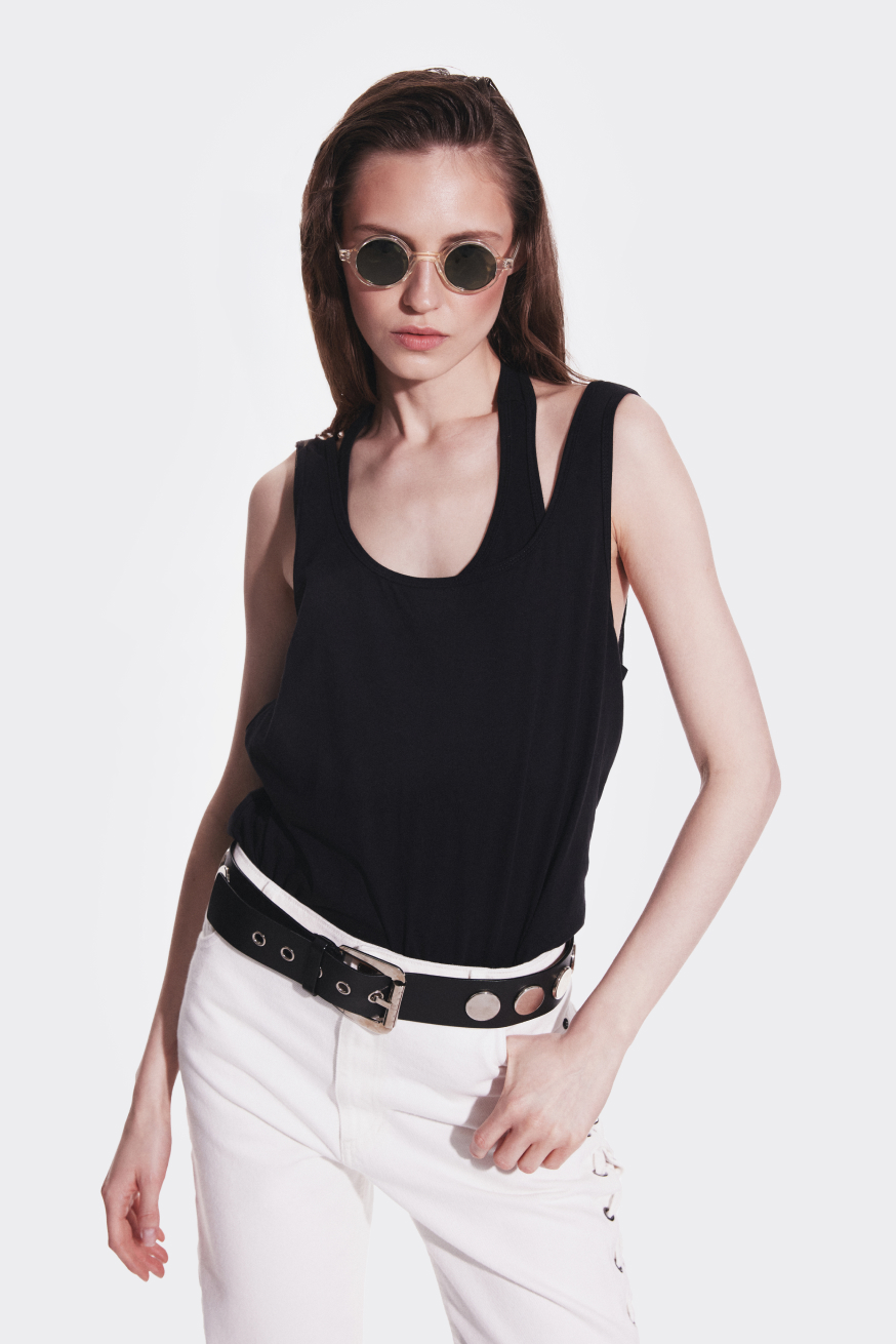 A set of two tops designed for effortless layering and everyday comfort. The set includes a classic strap top with a low, relaxed back neckline and a fitted racer tank with a sport-inspired silhouette. Worn together, the two pieces create a modern layered effect – the open back of the outer top subtly reveals the racer tank underneath, adding depth and an interesting play of shapes. Each piece can also be worn on its own, making the set versatile and easy to style.