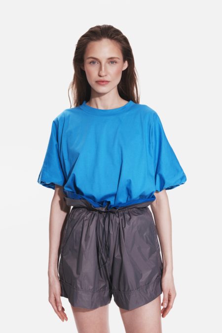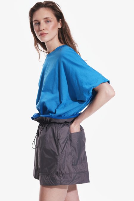 Minimalist shorts with a relaxed, sport-inspired feel, designed for comfort and effortless everyday wear. The loose silhouette and lightweight technical fabric make them an ideal choice for warmer days, offering ease of movement. An elasticated waistband with an adjustable drawstring allows for a personalised fit, while two practical side pockets add everyday functionality. The slightly wider leg opening gives the design a modern, easygoing shape.