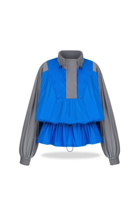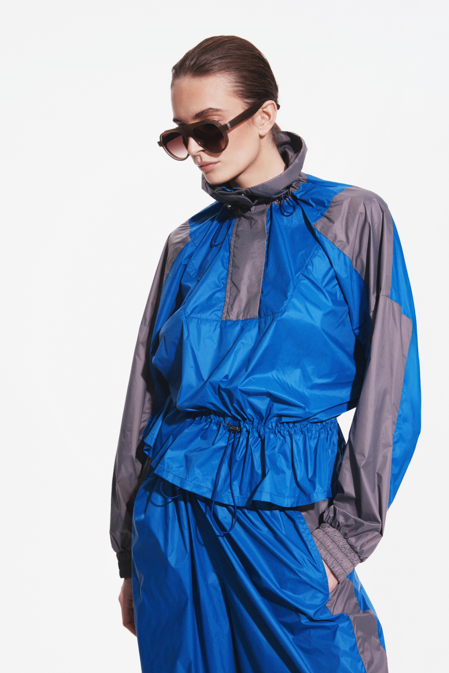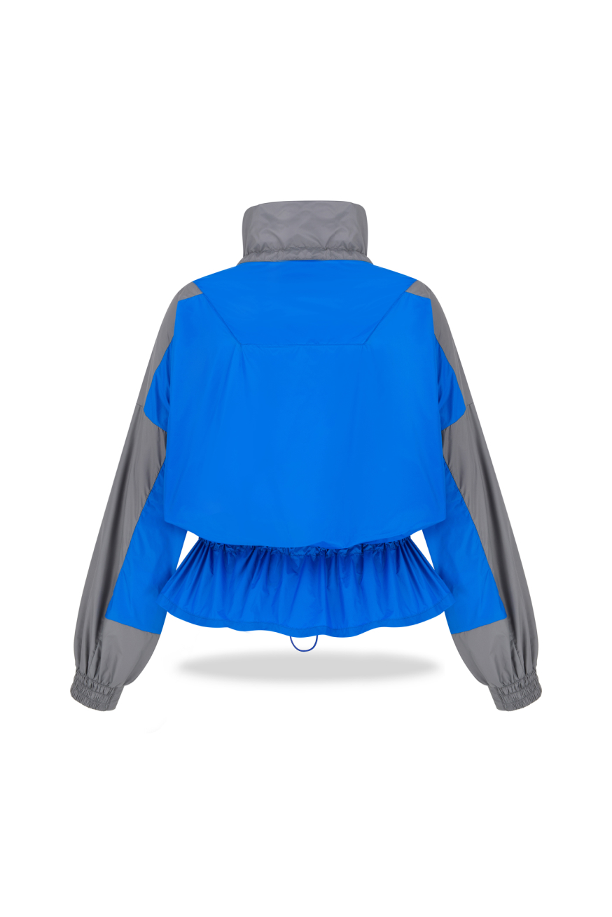 Elevate your outdoor aesthetic with this signature two-tone nylon windbreaker. This piece merges avant-garde silhouettes with functional versatility, creating a high-contrast look that atracts attention in any environment. Crafted from ultra-lightweight, premium nylon, the jacket features a unique peplum-style cinched waist with an adjustable cord, allowing you to transition from a relaxed, oversized fit to a sculpted, feminine profile.